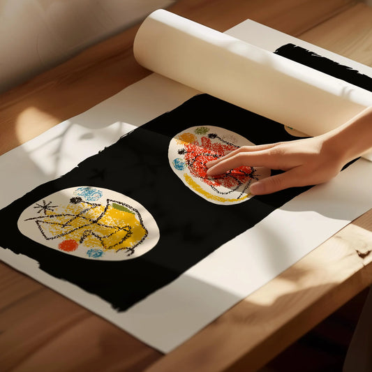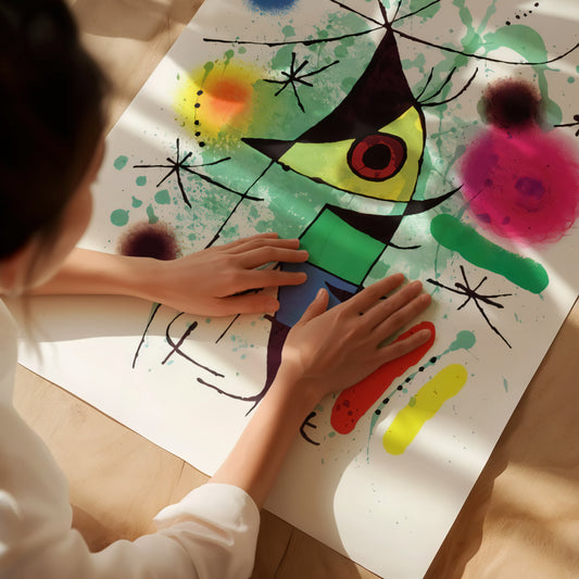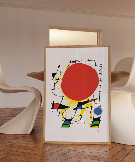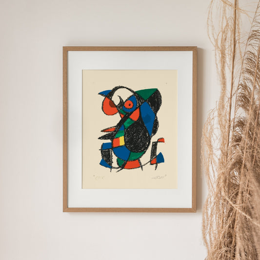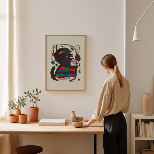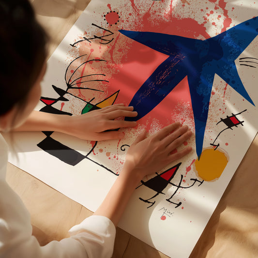 Joan Miró, geboren am 20. April 1893 in Barcelona, Spanien, und gestorben am 25. Dezember 1983 in Palma, Mallorca, war ein katalanischer Maler, der dafür bekannt war, abstrakte Kunst mit surrealistischen Elementen zu verbinden. Sein unverwechselbarer Stil entstand aus einer feinen Balance zwischen skurriler Poesie und einer ergreifenden Darstellung der Herausforderungen der modernen Welt. Mirós künstlerisches Schaffen ging über die Malerei hinaus und umfasste Lithografien, Wandgemälde, Wandteppiche und Skulpturen, mit denen er öffentliche Räume mit seinen fantasievollen Kreationen bereicherte.