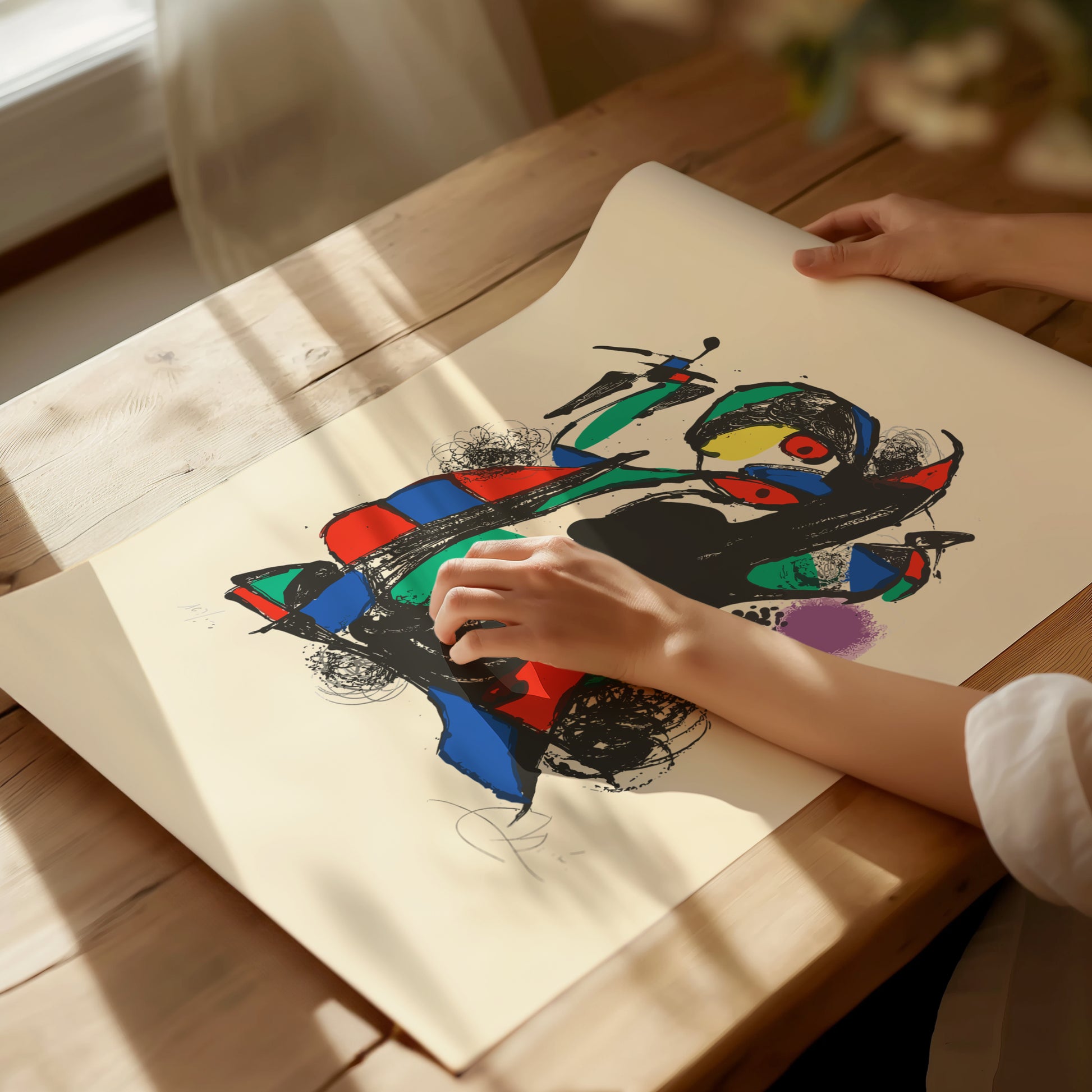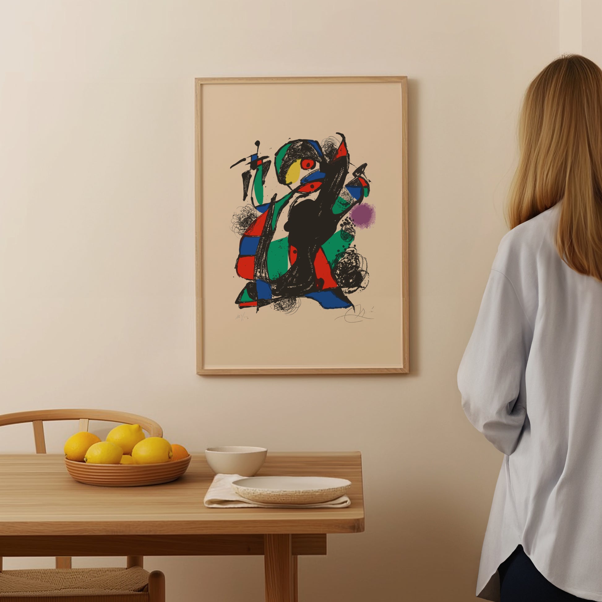 Joan Miró, geboren am 20. April 1893 in Barcelona, Spanien, und gestorben am 25. Dezember 1983 in Palma, Mallorca, war ein katalanischer Maler, der dafür bekannt war, abstrakte Kunst mit surrealistischen Elementen zu verbinden. Sein unverwechselbarer Stil entstand aus einer feinen Balance zwischen skurriler Poesie und einer ergreifenden Darstellung der Herausforderungen der modernen Welt. Mirós künstlerisches Schaffen ging über die Malerei hinaus und umfasste Lithografien, Wandgemälde, Wandteppiche und Skulpturen, mit denen er öffentliche Räume mit seinen fantasievollen Kreationen bereicherte.