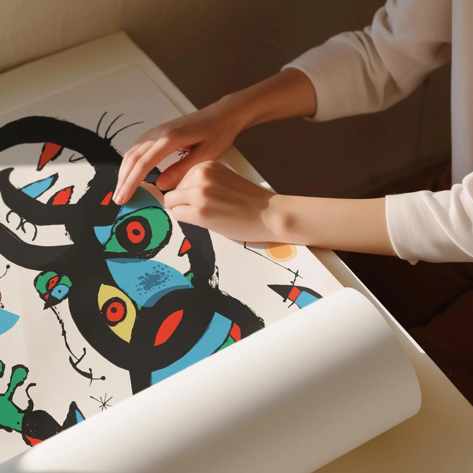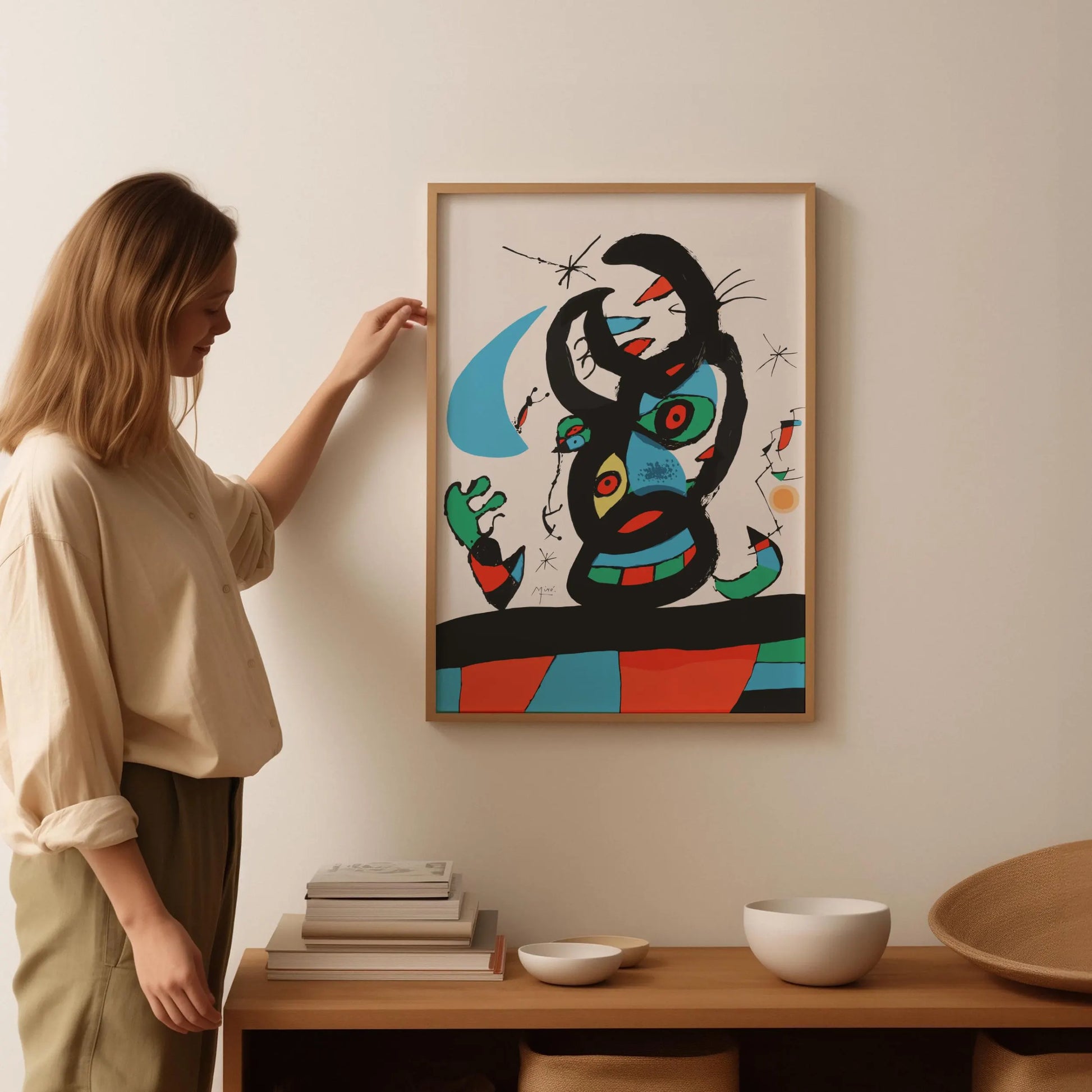Printed representation of the famous art by Joan Miró, Montroig I, 1974. Joan Miró, born April 20, 1893, in Barcelona, Spain, and passing away on December 25, 1983, in Palma, Majorca, was a Catalan painter renowned for blending abstract art with Surrealist elements. His distinctive style emerged from a delicate balance between whimsical poetry and a poignant portrayal of the modern world's challenges. Miró's artistic endeavors extended beyond painting, encompassing lithography, murals, tapestries, and sculptures, enriching public spaces with his imaginative creations.