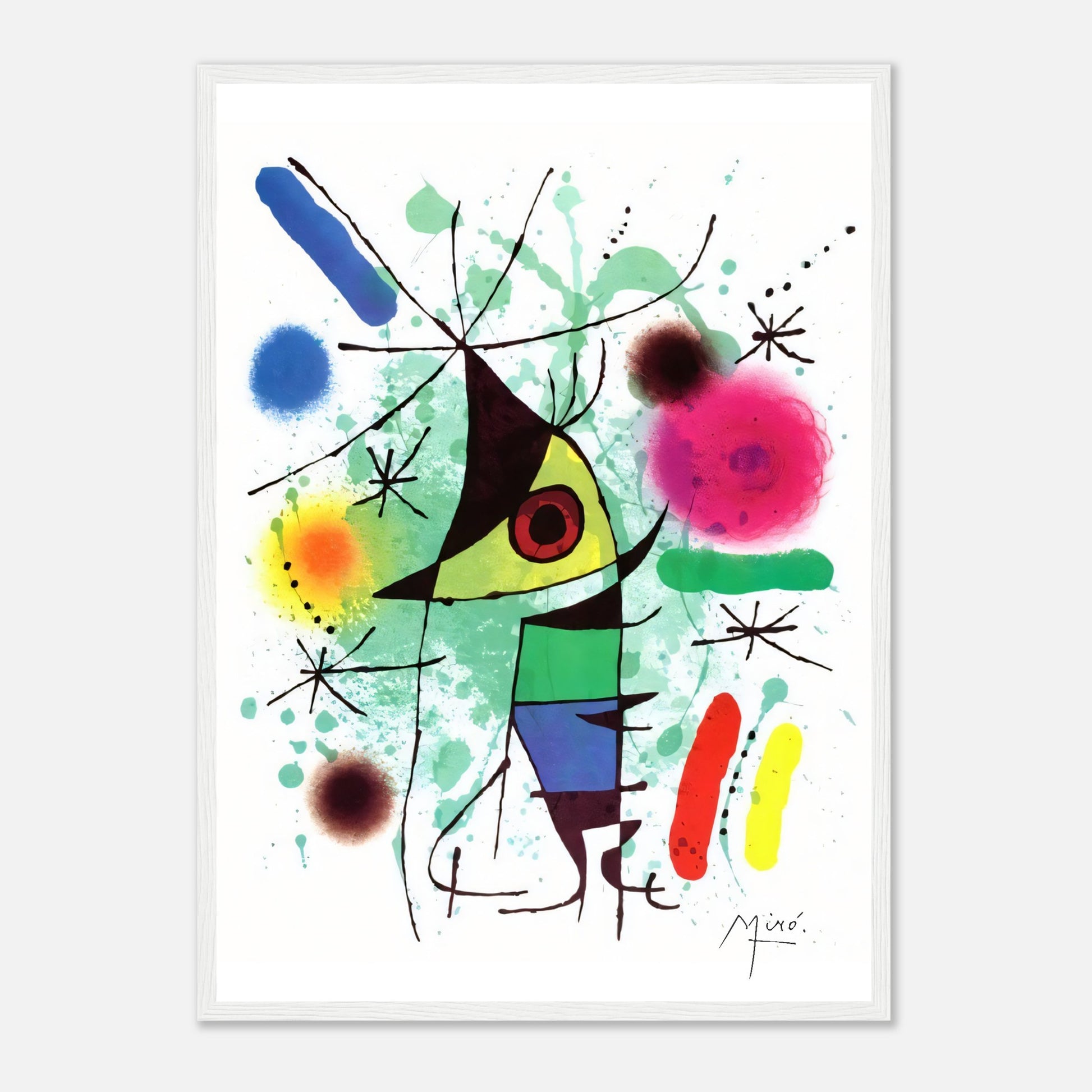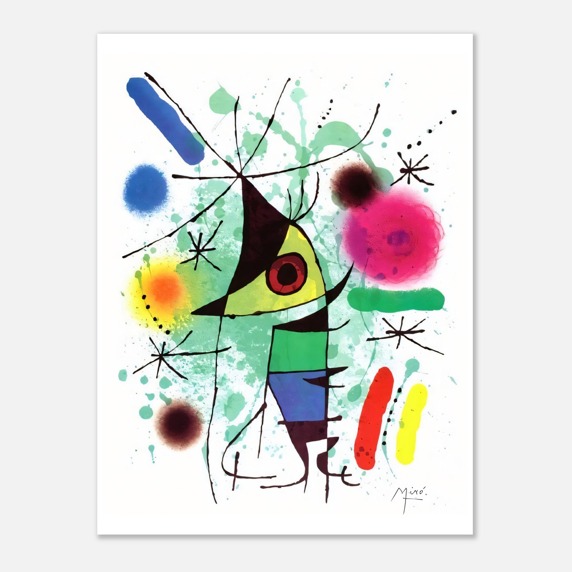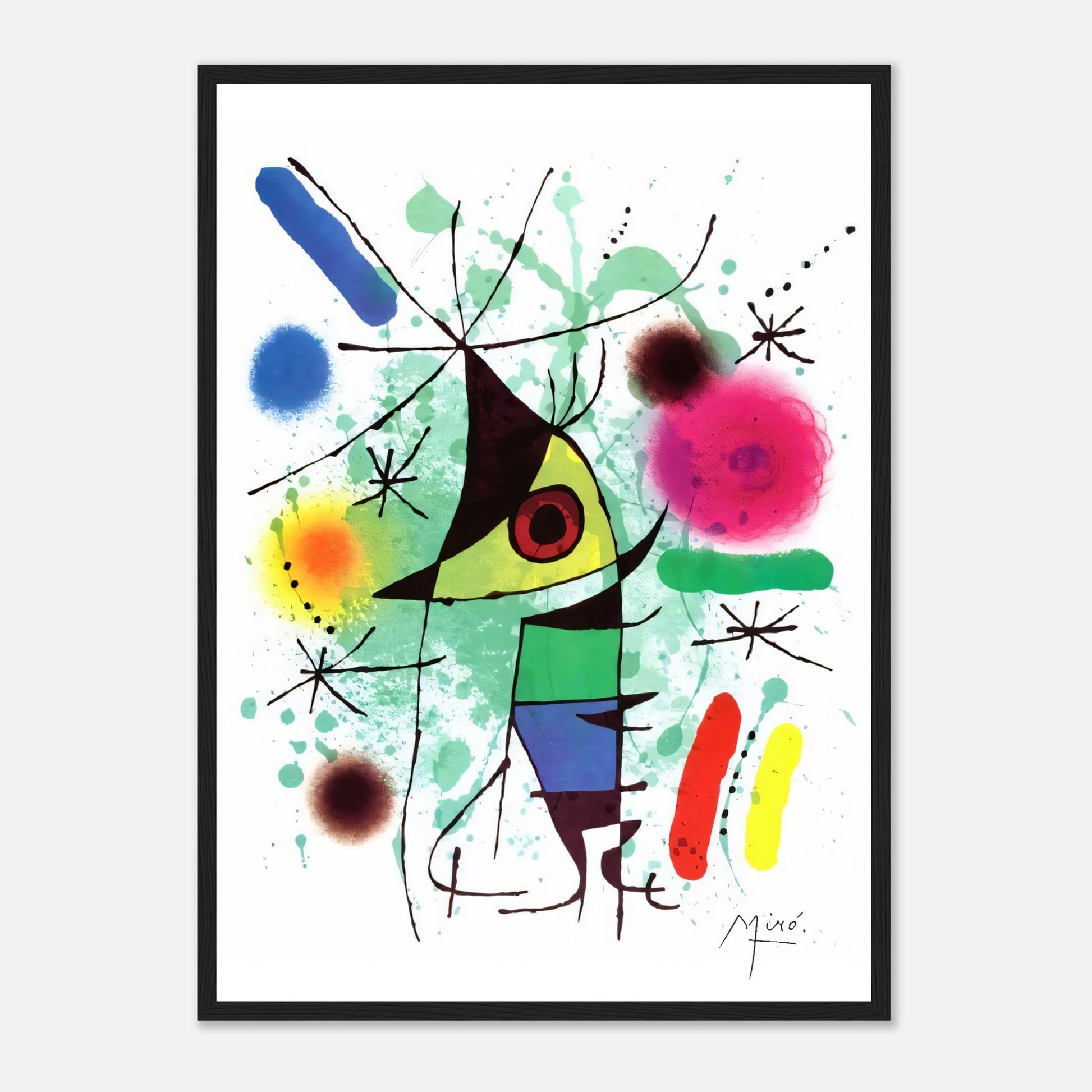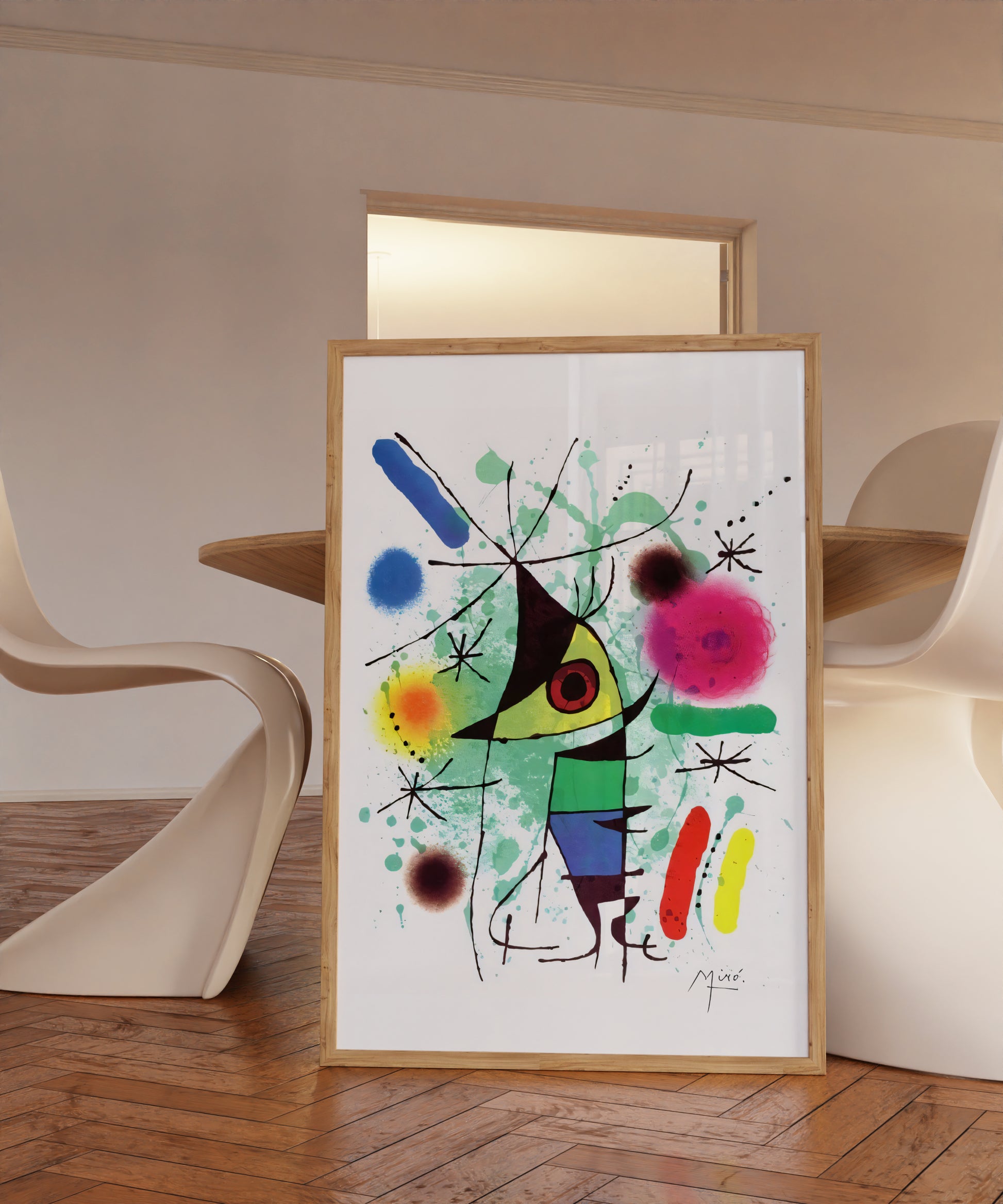 Der unverwechselbare Stil von Miro kommt in „The Singing Fish“ zum Ausdruck, wo er gekonnt stark abstrakte Formen verschmilzt, um die Tiefe seiner Fantasie zu vermitteln. Das Herzstück dieses Kunstwerks ist der Kopf des Fisches, der so positioniert ist, dass er nach oben links auf die Leinwand blickt. Sein Auge wird durch zwei abstrakte Kreise dargestellt.