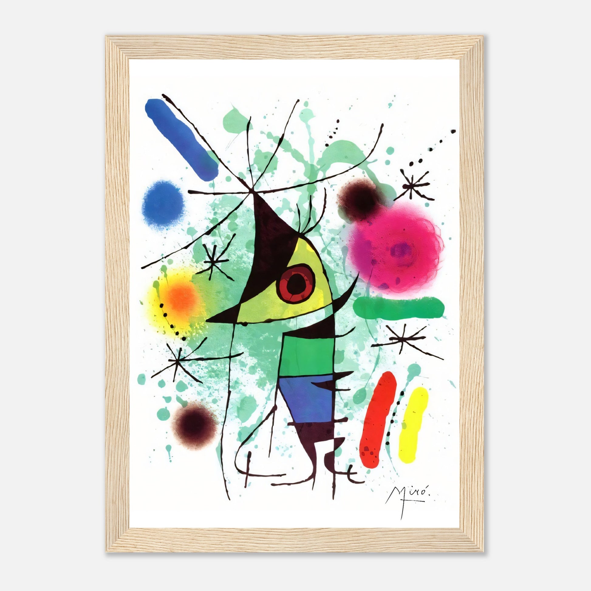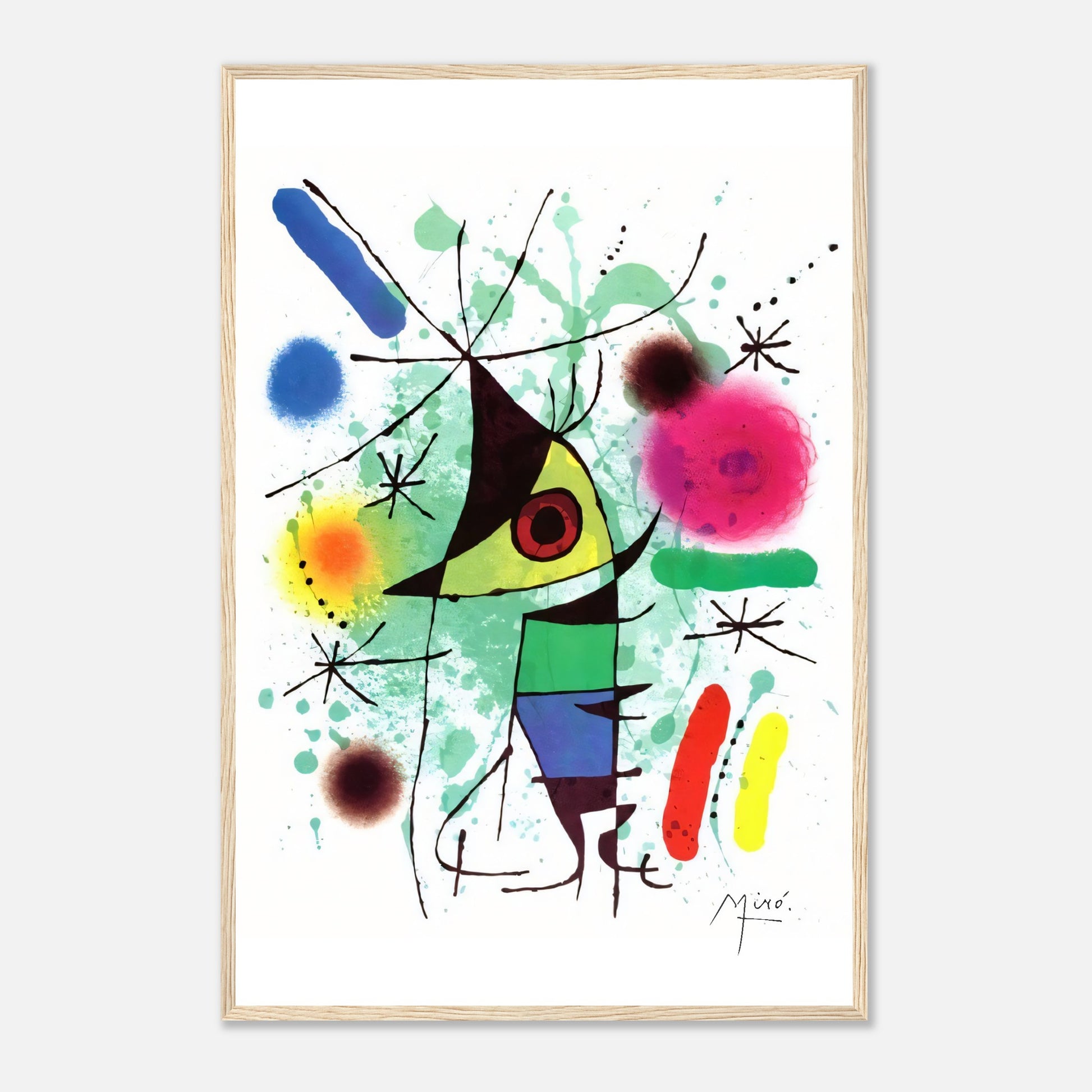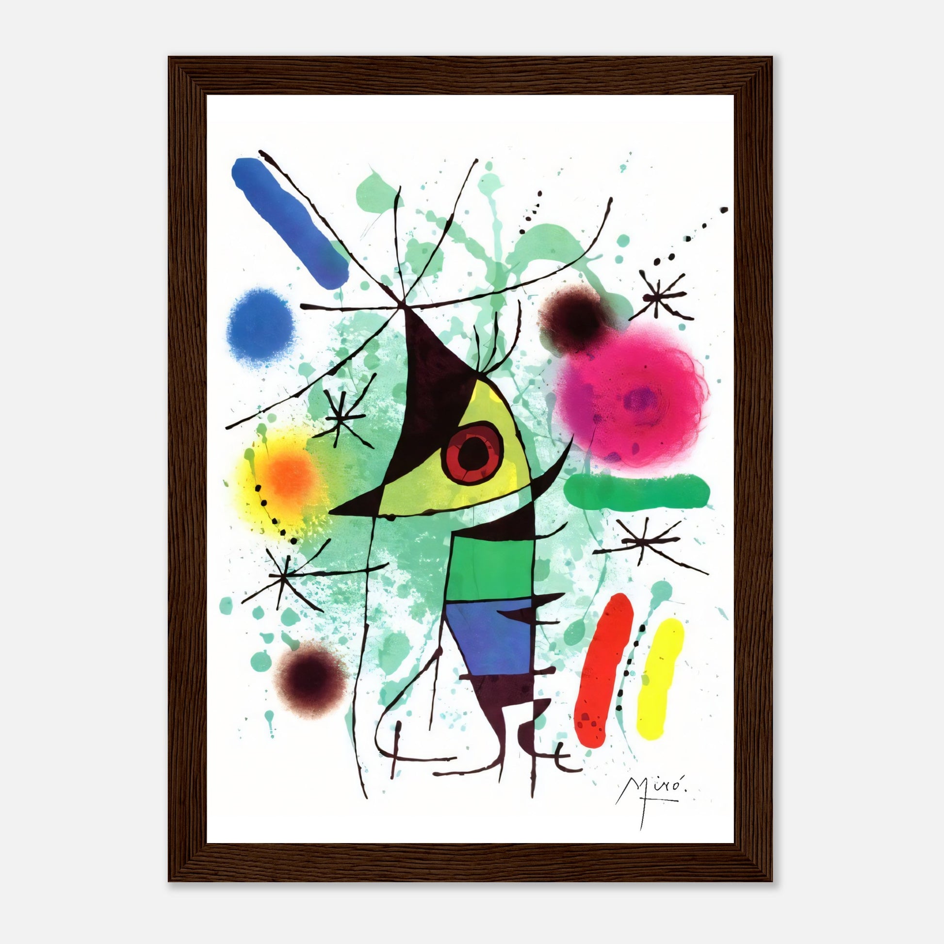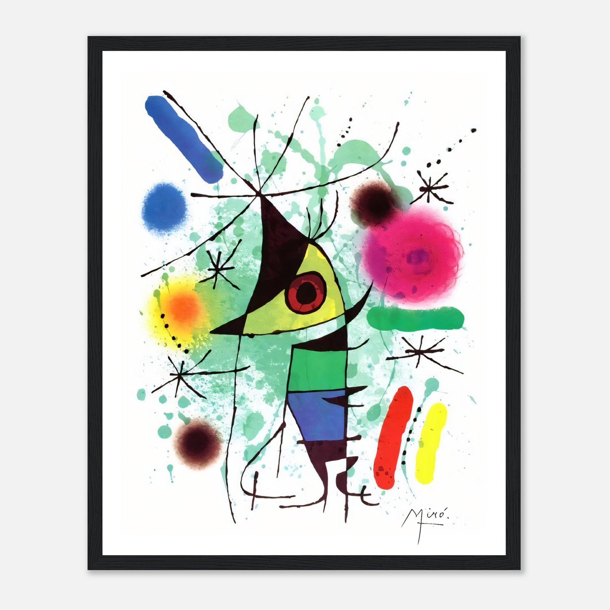 Der unverwechselbare Stil von Miro kommt in „The Singing Fish“ zum Ausdruck, wo er gekonnt stark abstrakte Formen verschmilzt, um die Tiefe seiner Fantasie zu vermitteln. Das Herzstück dieses Kunstwerks ist der Kopf des Fisches, der so positioniert ist, dass er nach oben links auf die Leinwand blickt. Sein Auge wird durch zwei abstrakte Kreise dargestellt.