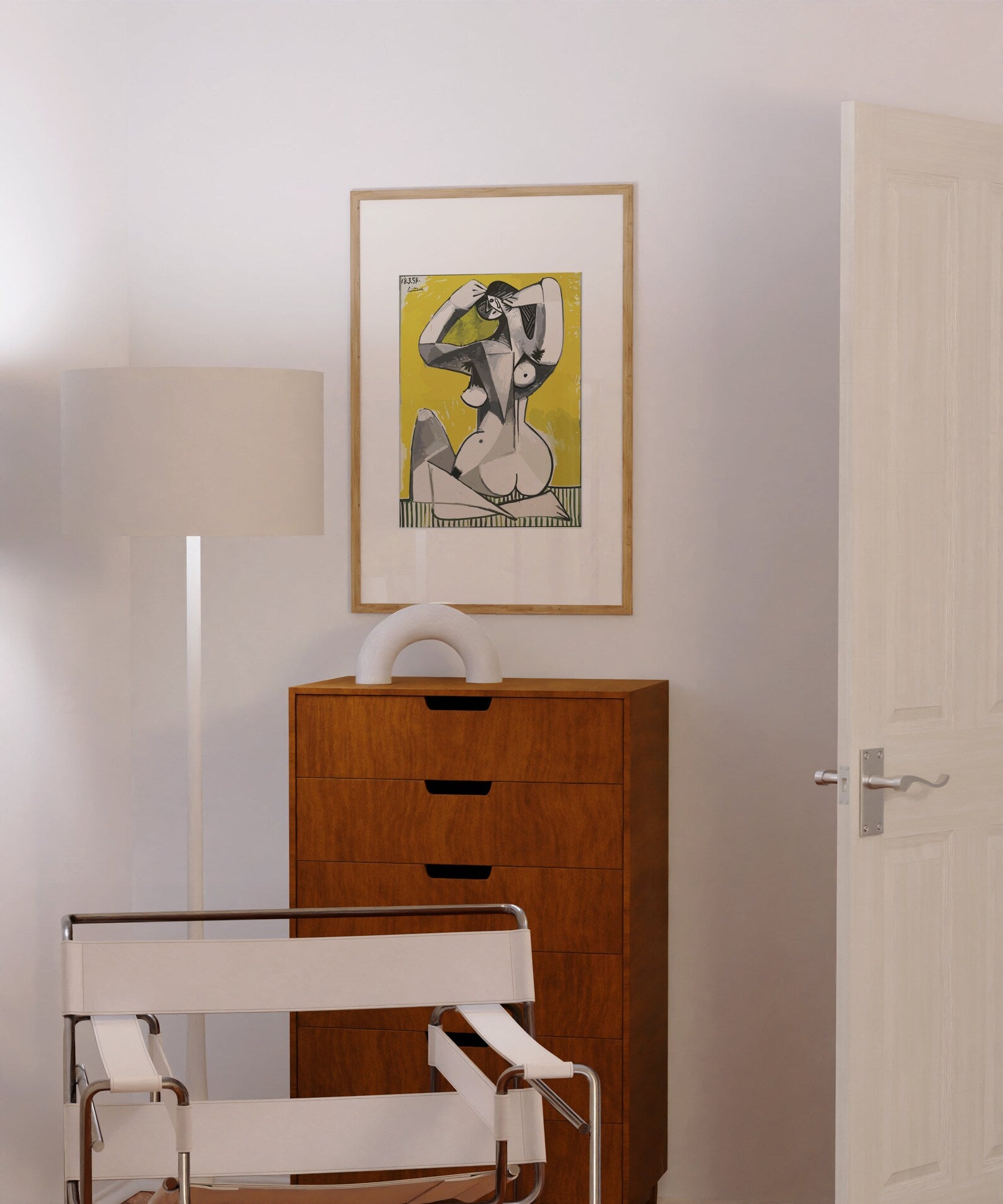 Während seiner künstlerischen Laufbahn fertigte Pablo Picasso mehrere Gemälde an, die nackte Frauen in geduckter Haltung darstellen. Ein bemerkenswertes Werk ist „Nu Accroupi“ (Sitzende Frau). Picasso galt als Wegbereiter der kubistischen Kunstbewegung, einem radikalen Stil, der inmitten der turbulenten Veränderungen der Moderne entstand und sich kühn von konventionellen Vorstellungen von Perspektive und Realismus löste. Im Gegensatz zu den ruhigen Formen klassischer Aktdarstellungen der Antike verlieh Picasso diesem Gemälde eine originelle Komposition und trug damit zu seiner kubistischen Rebellion gegen die Tradition bei.