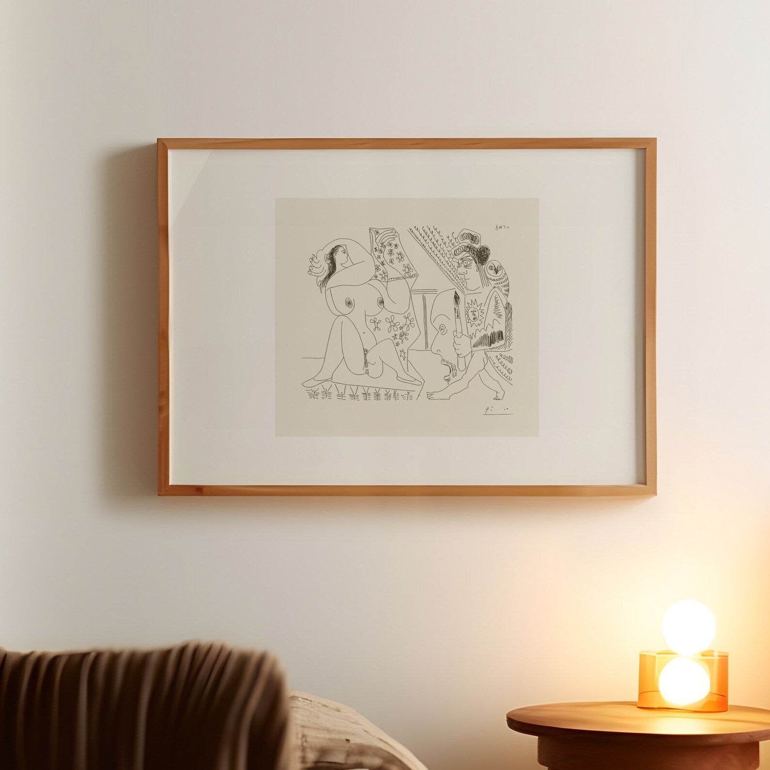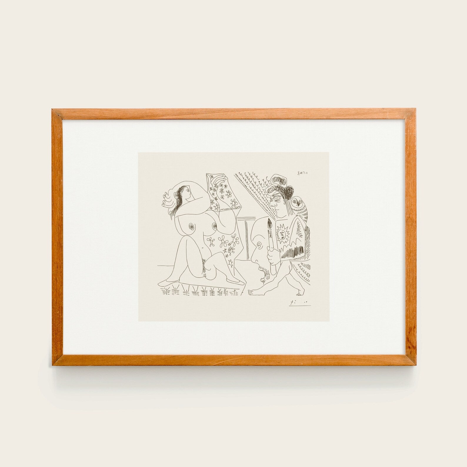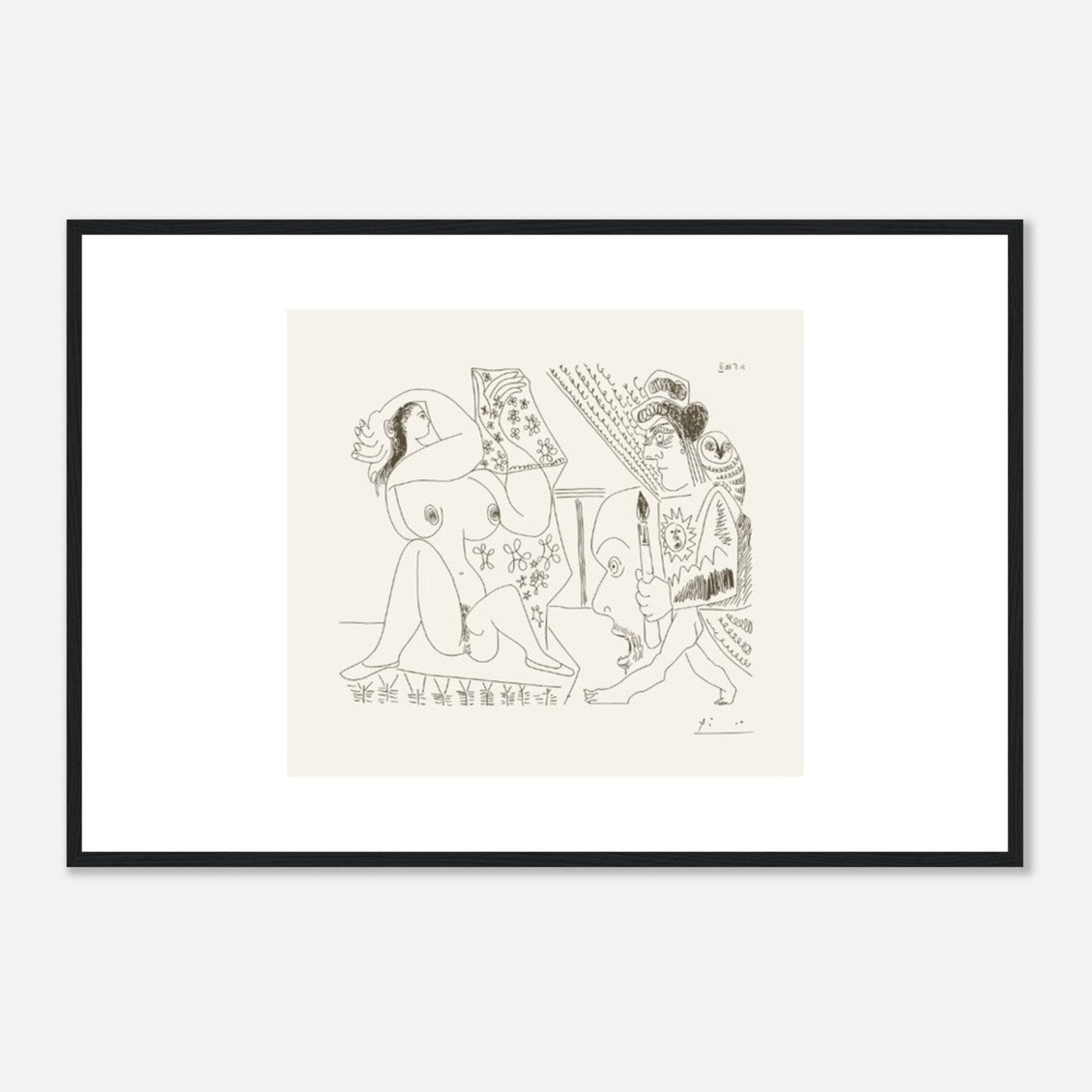 Radierung auf Papier. Maler und Modell, 1970. Eine Aktdarstellung eines Malers, der mit seinem nackten Frauenmodell ein Kunstwerk schafft.
