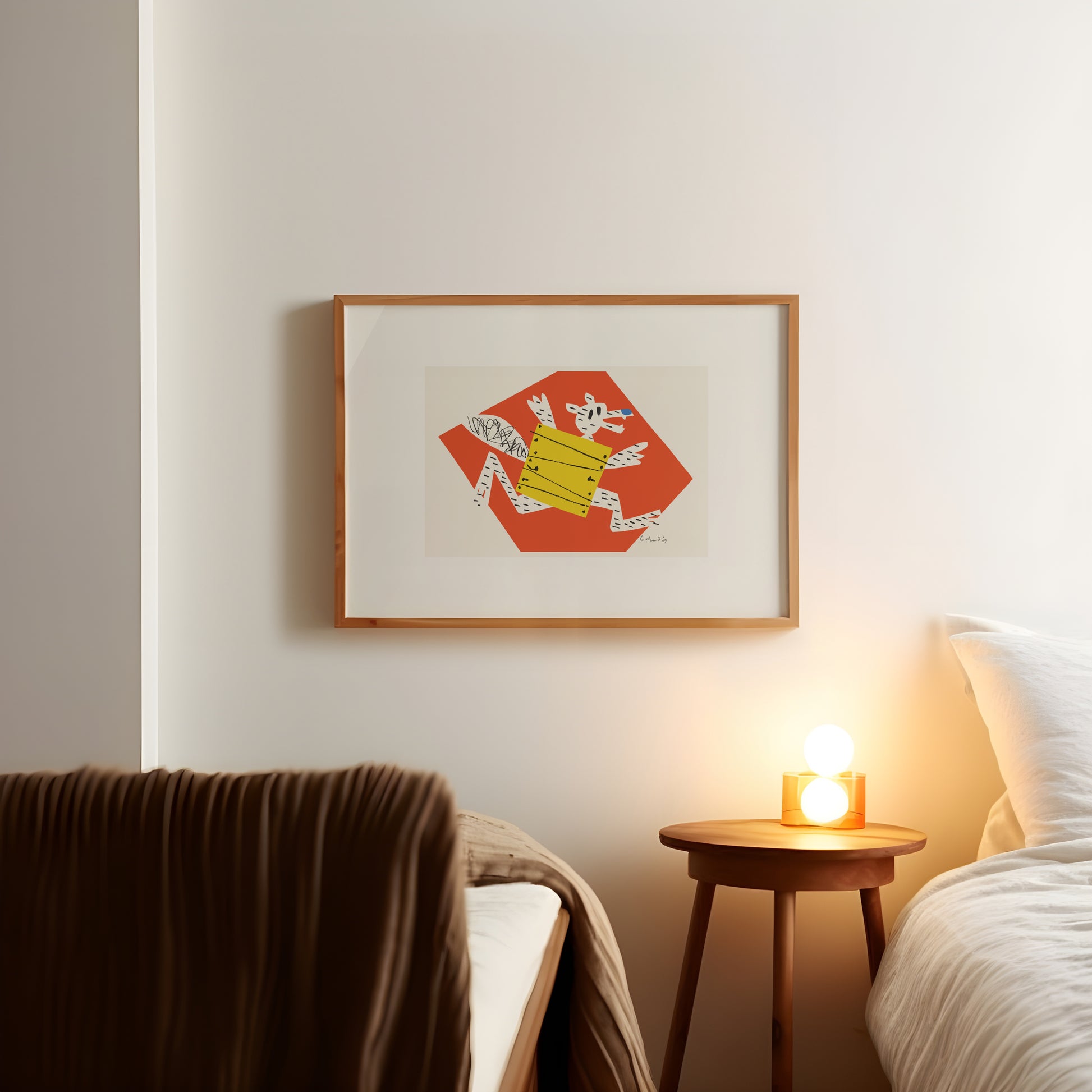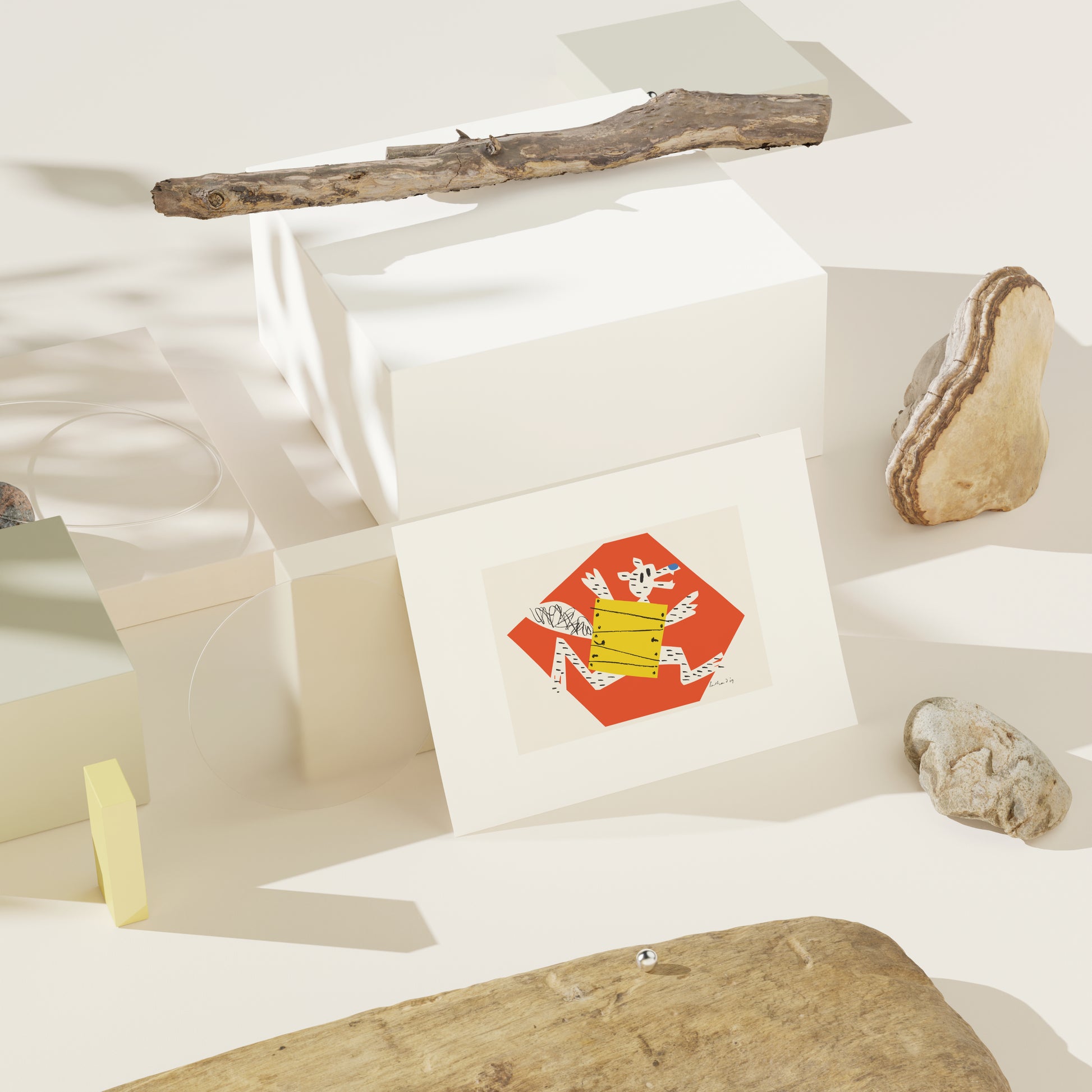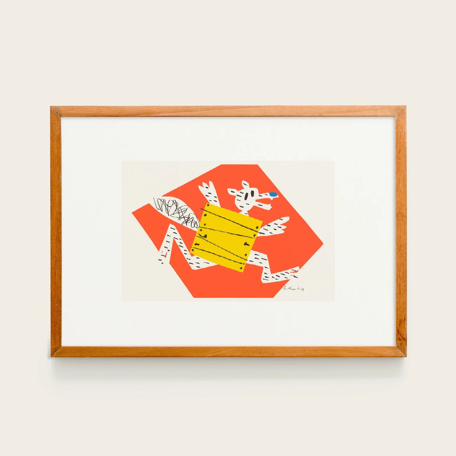 Vor einem cremefarbenen Hintergrund dominiert ein rotes, unregelmäßiges Rechteck den Großteil des Blattes, dessen Ober- und Unterkante absichtlich abgeschnitten sind. In dieser markanten Form ist ein lebhafter Fuchs im Negativraum dargestellt, mit schwarzen Streifen, einem gewundenen schwarzen Schwanz, tiefschwarzen Augen und einer Nase in leuchtendem Blau. Der Fuchs scheint mit einer gelben Holzkiste geschmückt zu sein, die mit horizontalen schwarzen Streifen verziert ist, während schwarze Punkte den linken und rechten Rand der Kiste betonen.