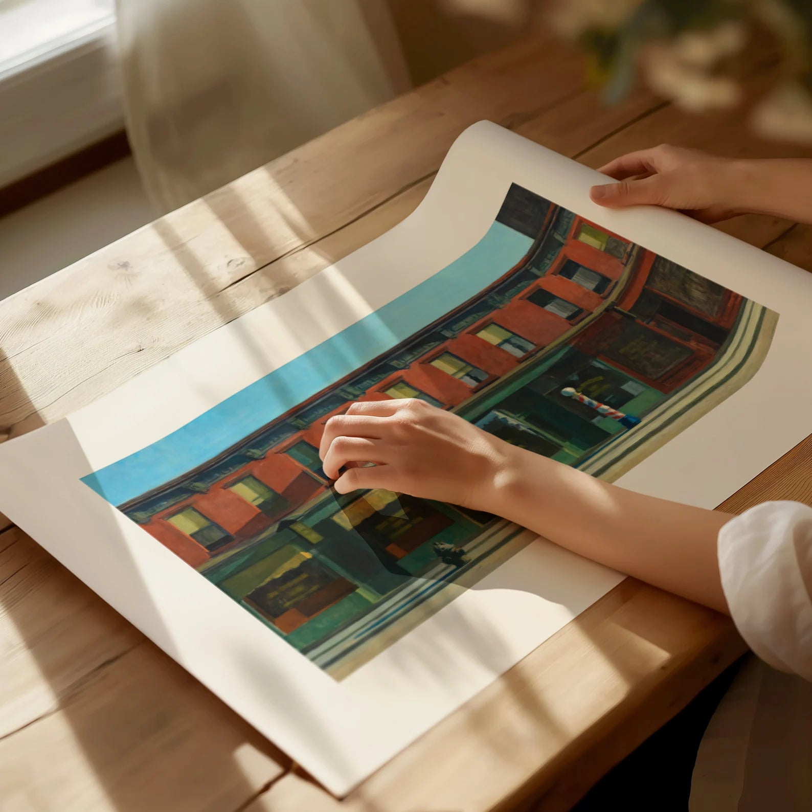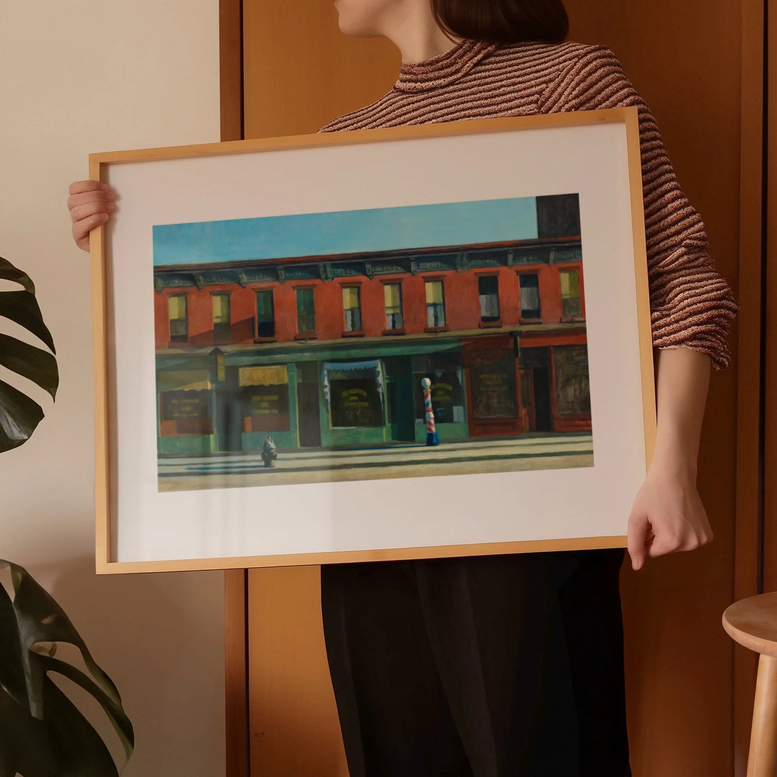 Early Sunday Morning, a painting that can either be taken as a quiet and peaceful scene of small businesses that are closed or considered a comment on the Depression. Hopper pointed out in a conversation that the word Sunday was not part of the original title. "I am fond of Early Sunday Morning, too - but it wasn't necessarily Sunday. That word was tacked on by someone else."