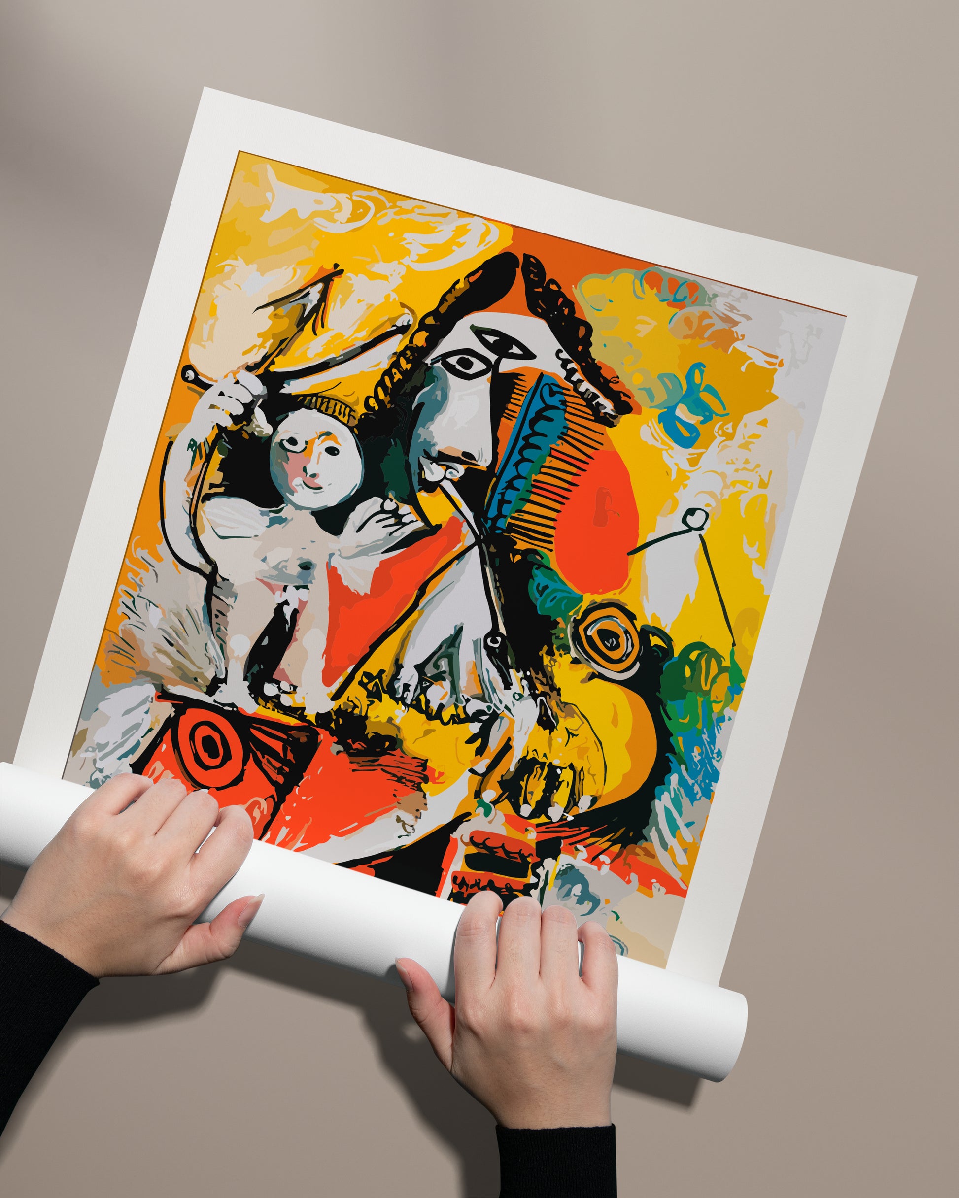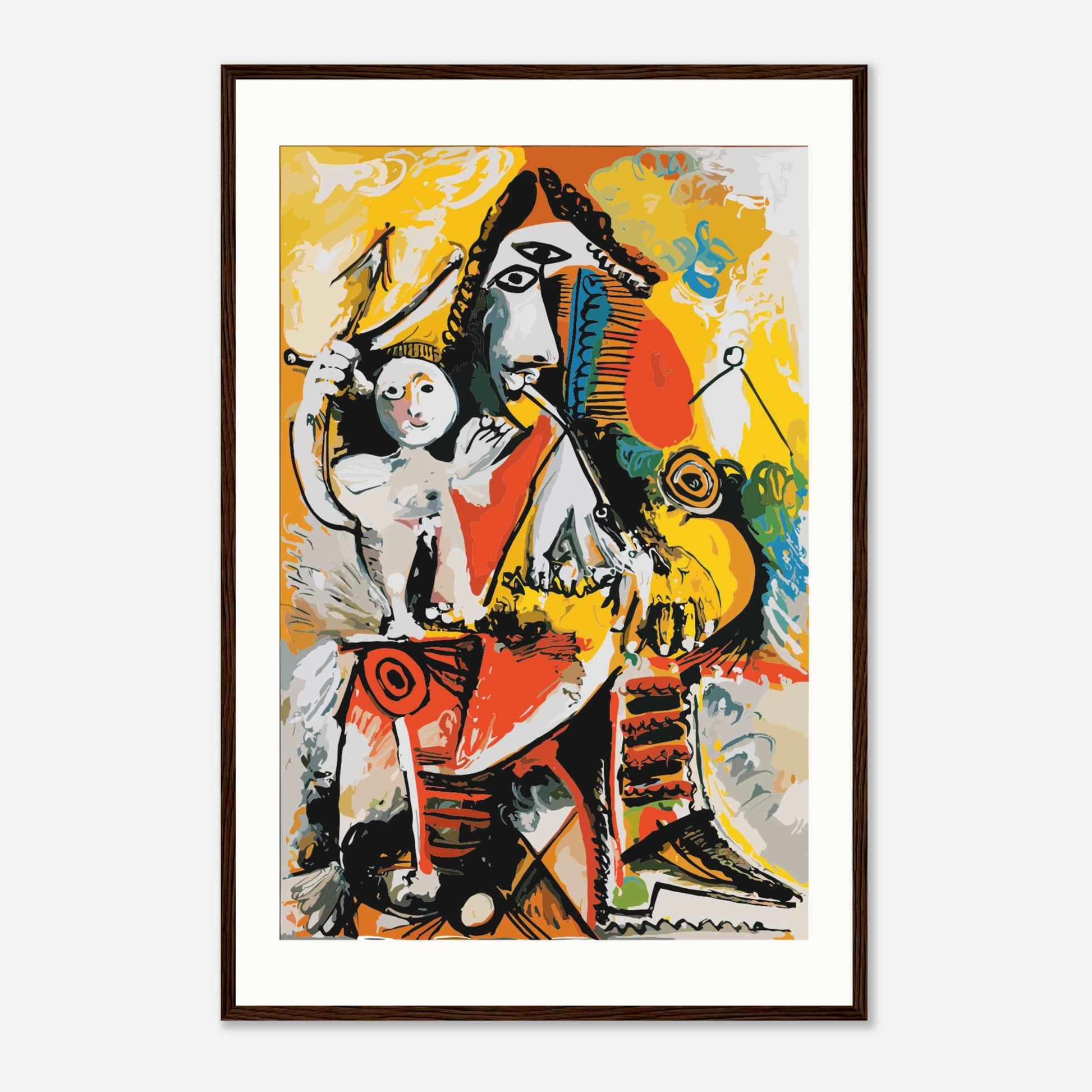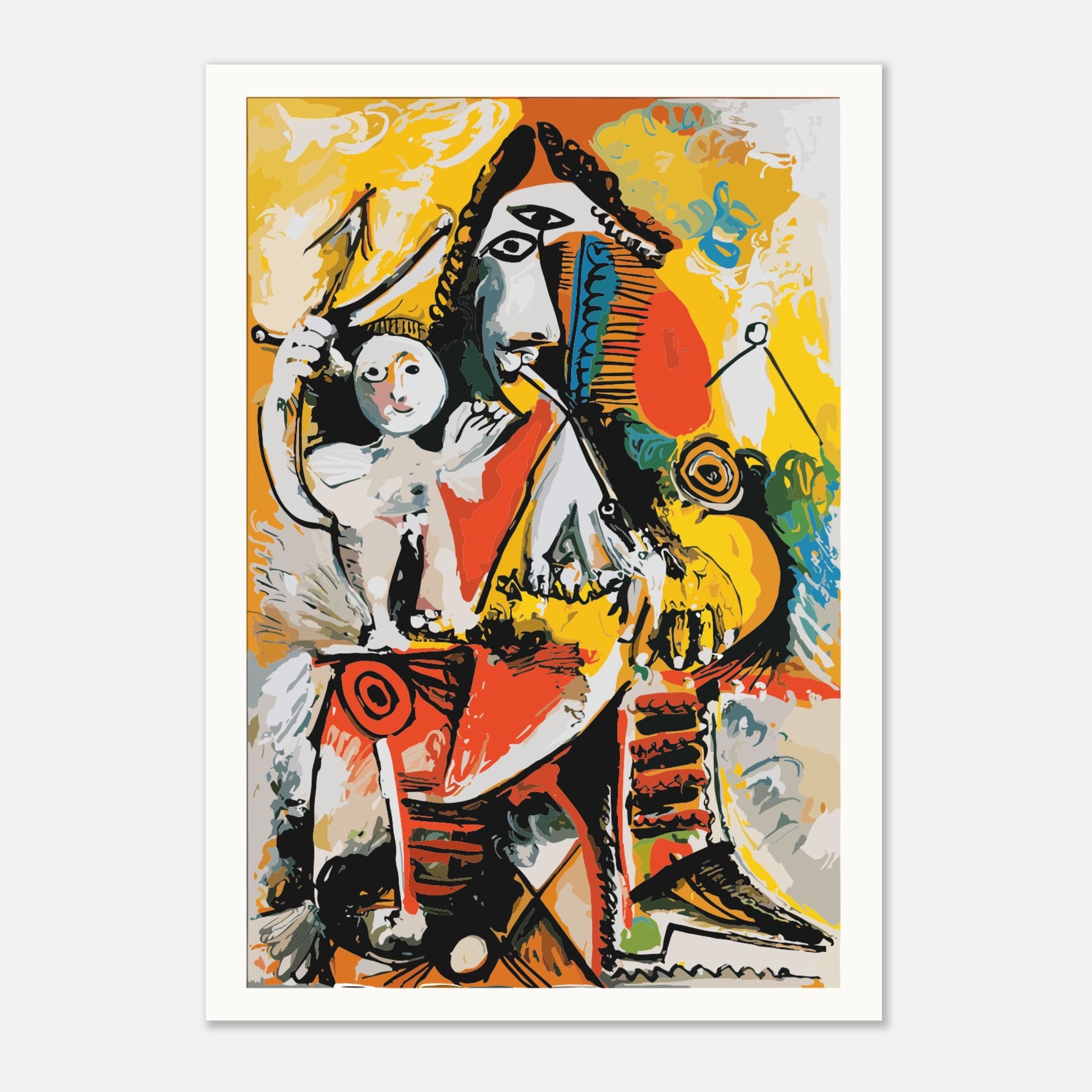 In this painting, Pablo Picasso captures the classical mythological scene of Cupid, the god of love and desire, seated on the lap of the musketeer—a recurring figure in Picasso's oeuvre symbolizing strength and superiority. The composition is adorned with blocks of red and yellow, hues intricately associated with passion. Notably, Cupid, with an arrow pointed skyward, introduces an air of mystery, leaving the intended recipient of this artwork concealed in enigmatic allure.