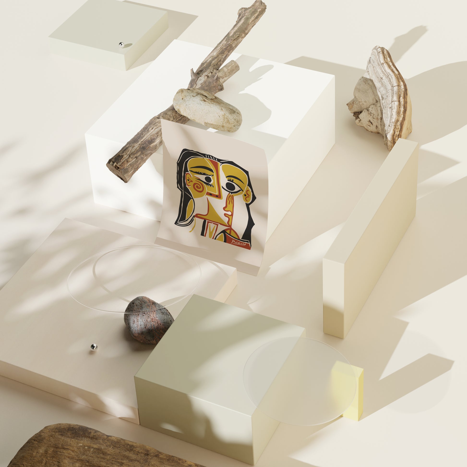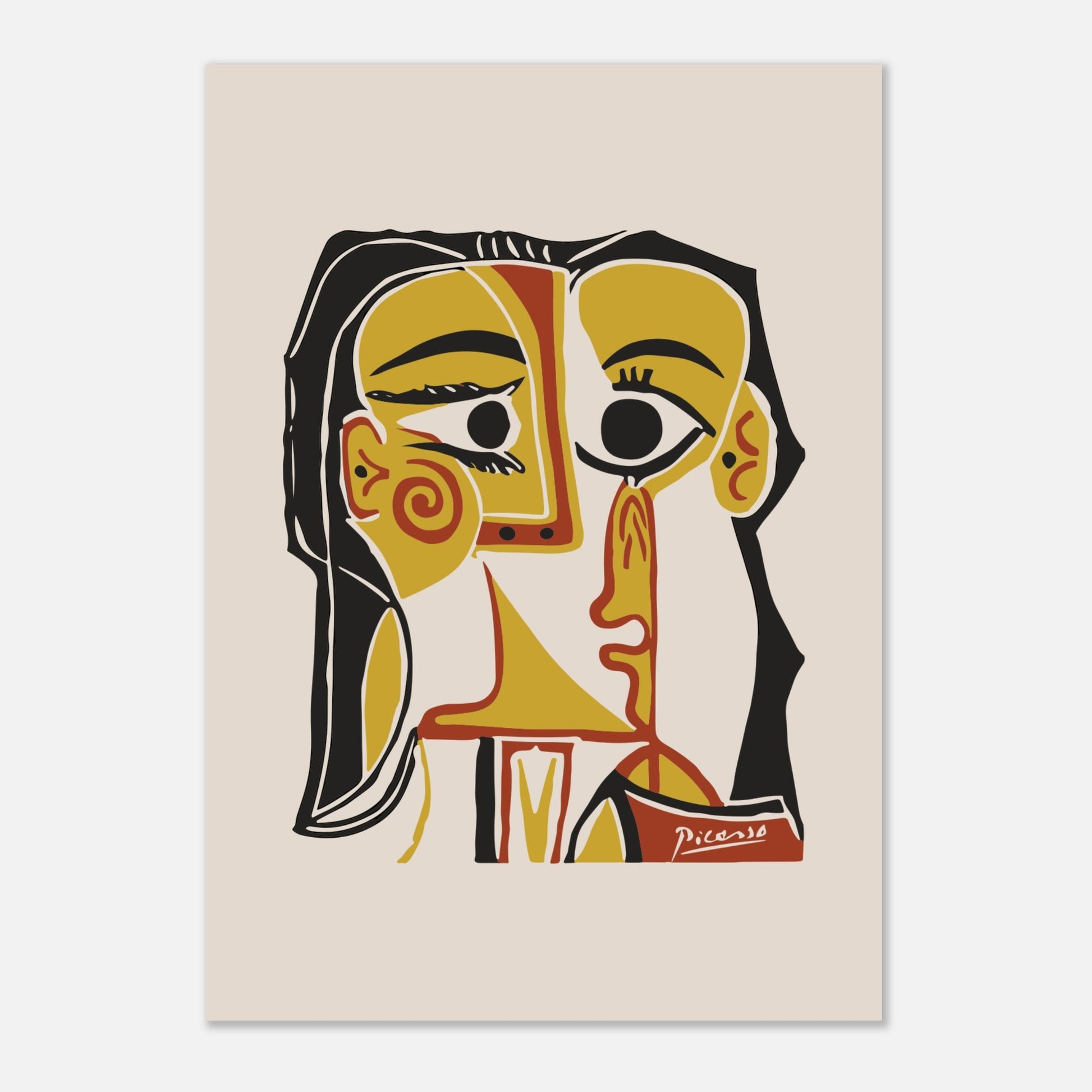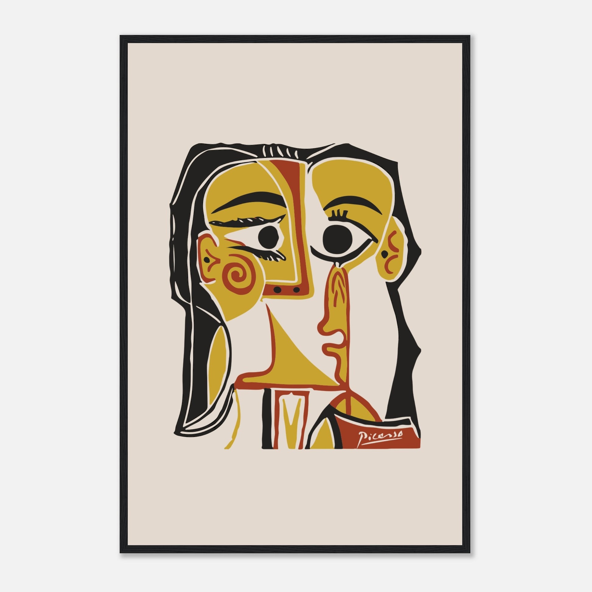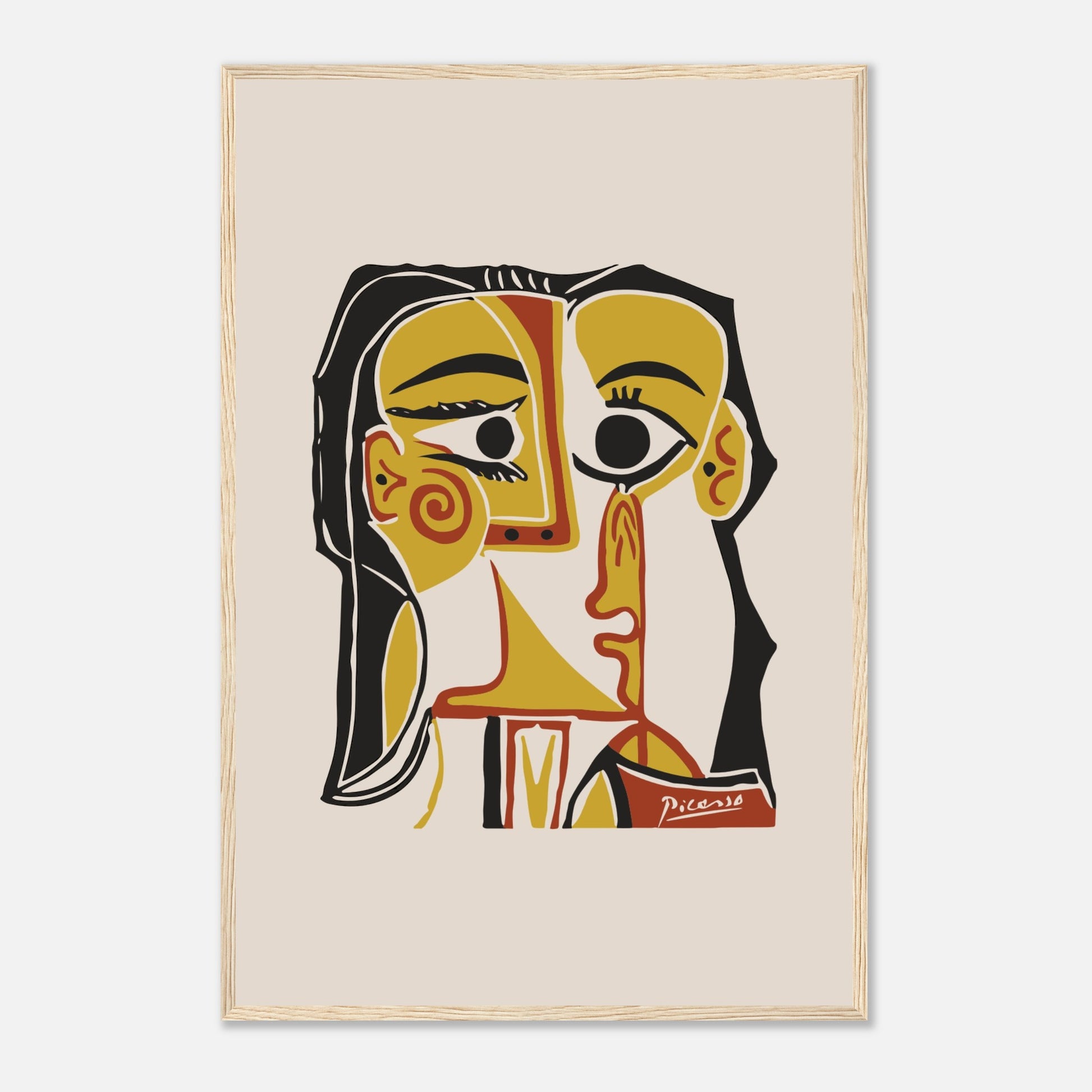 This fine art is a stylized representation from the famous Pablo Picasso's Jacqueline au Bandeau de Face (Grand Tête de Femme), 1962, a bright and unique depiction of Pablo Picasso’s last and final muse, Jacqueline Roque.