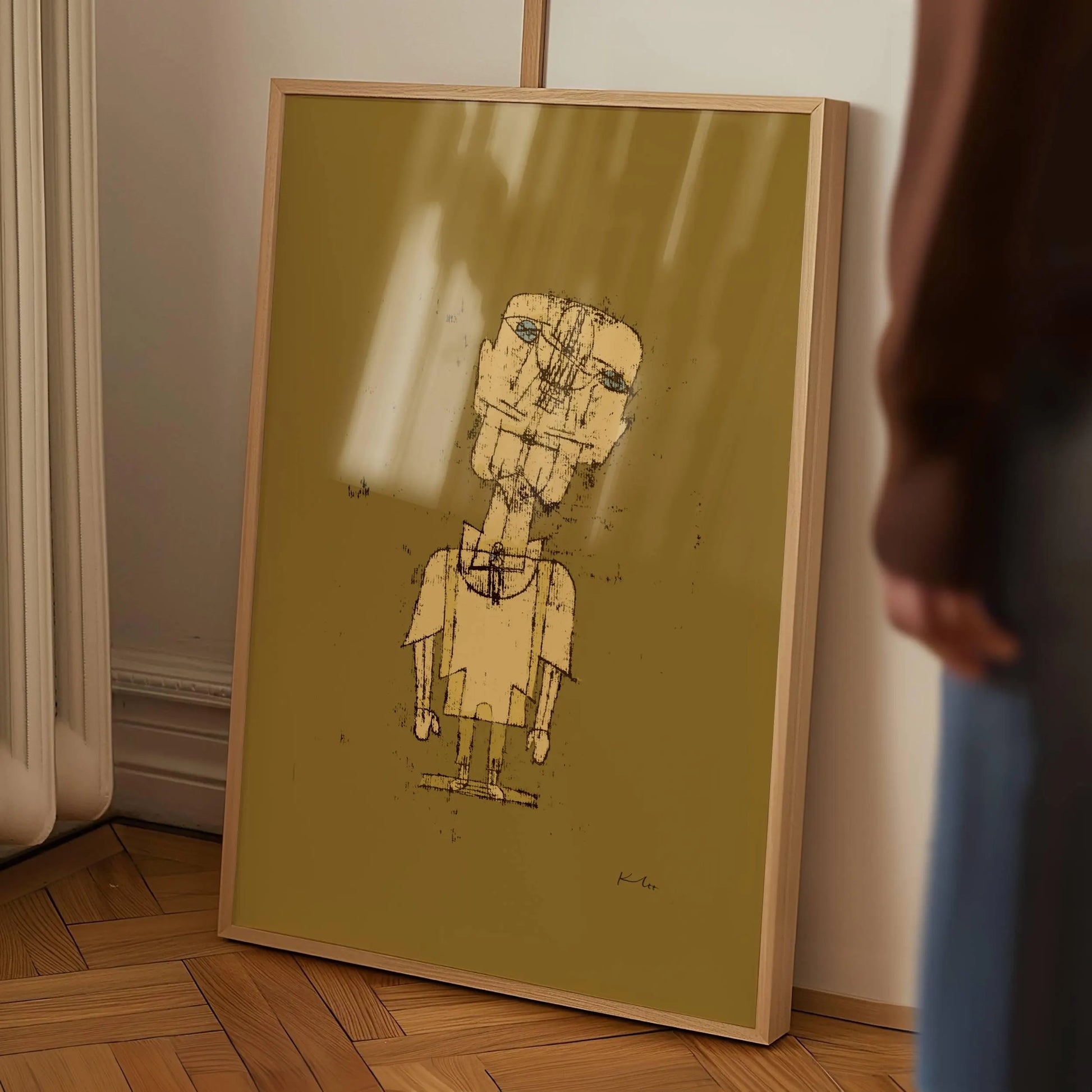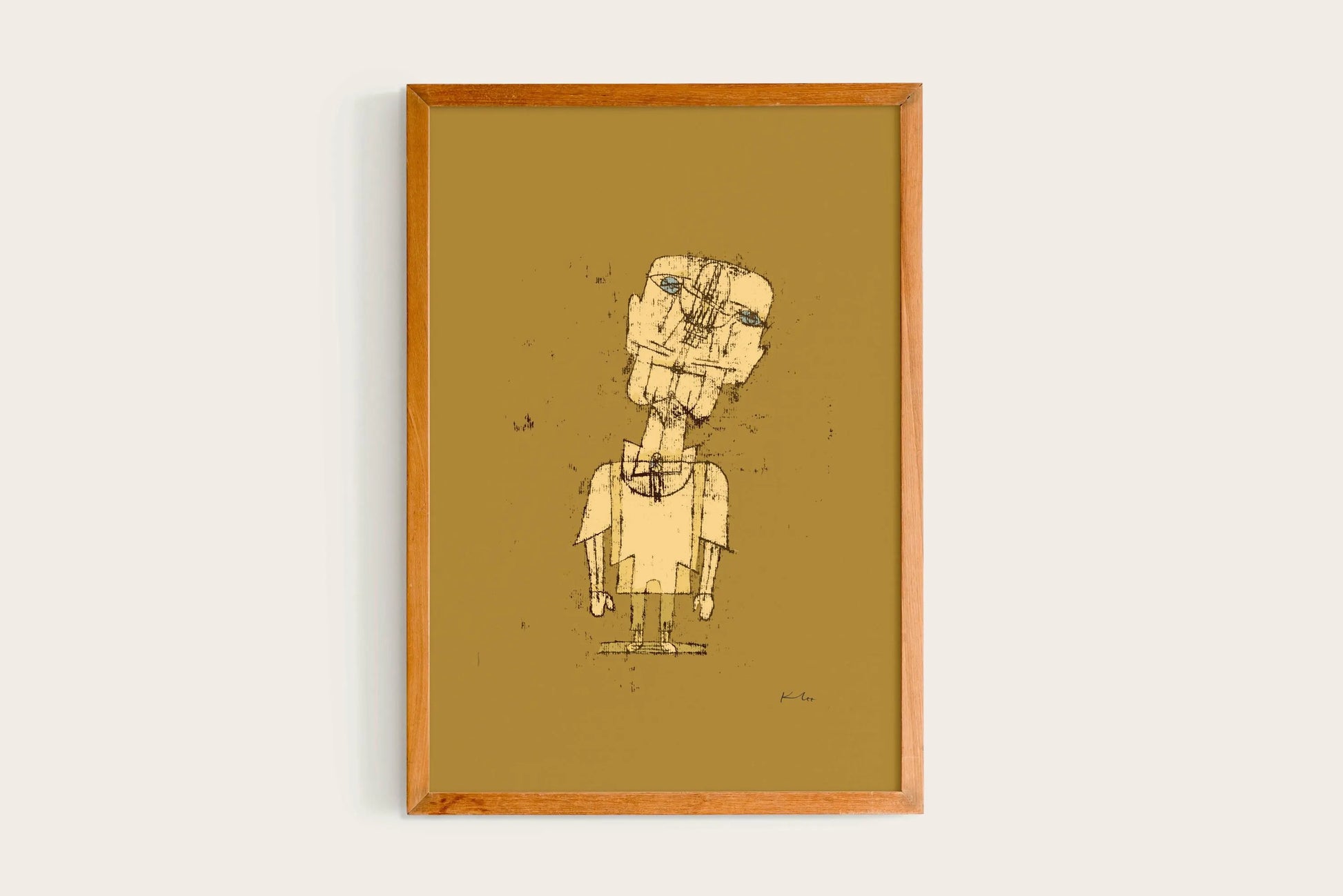 The oversized head of the doll-like figure is attached to the Adam’s apple by a hinge, looming over the rest of the body. Bright blue eyes shine with an uncanny glow. In stark contrast, its hands and feet are minuscule, and the arms hang limply at its sides. The body appears almost incapable of movement; the heavy head droops sideways under its own weight. Born in 1879 in Münchenbuchsee, Switzerland, Paul Klee was a painter and graphic artist renowned for his distinctive and individualistic style. His artistic creations often delve into abstraction, featuring vibrant colors and playful lines that evoke a whimsical atmosphere. As a member of the "Blaue Reiter" (Blue Rider) group of artists, Klee's work bears the influence of Cubism and Surrealism, showcasing a fusion of innovative perspectives. The artist passed away in 1940, leaving behind a legacy of visually captivating and thought-provoking pieces.